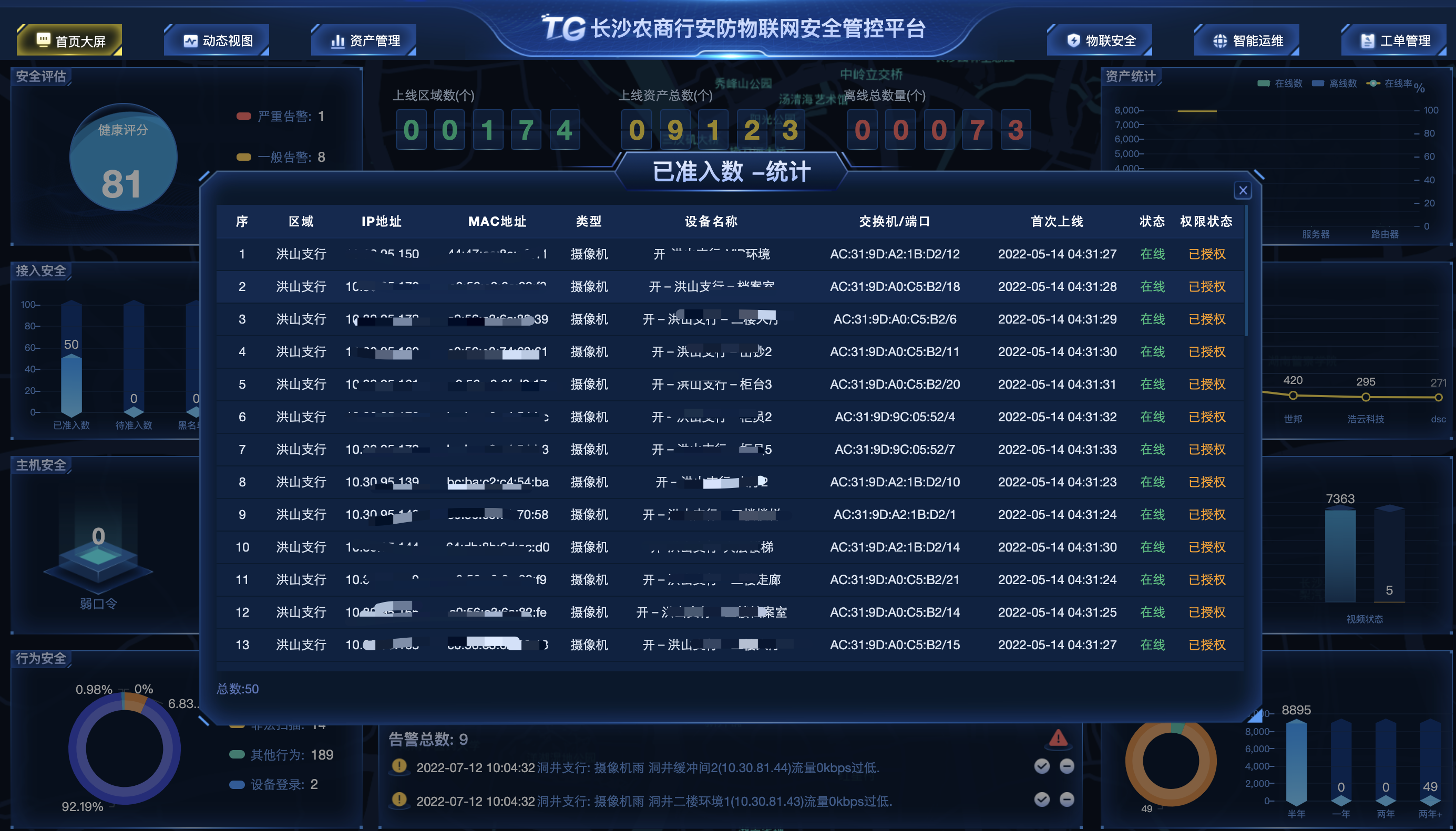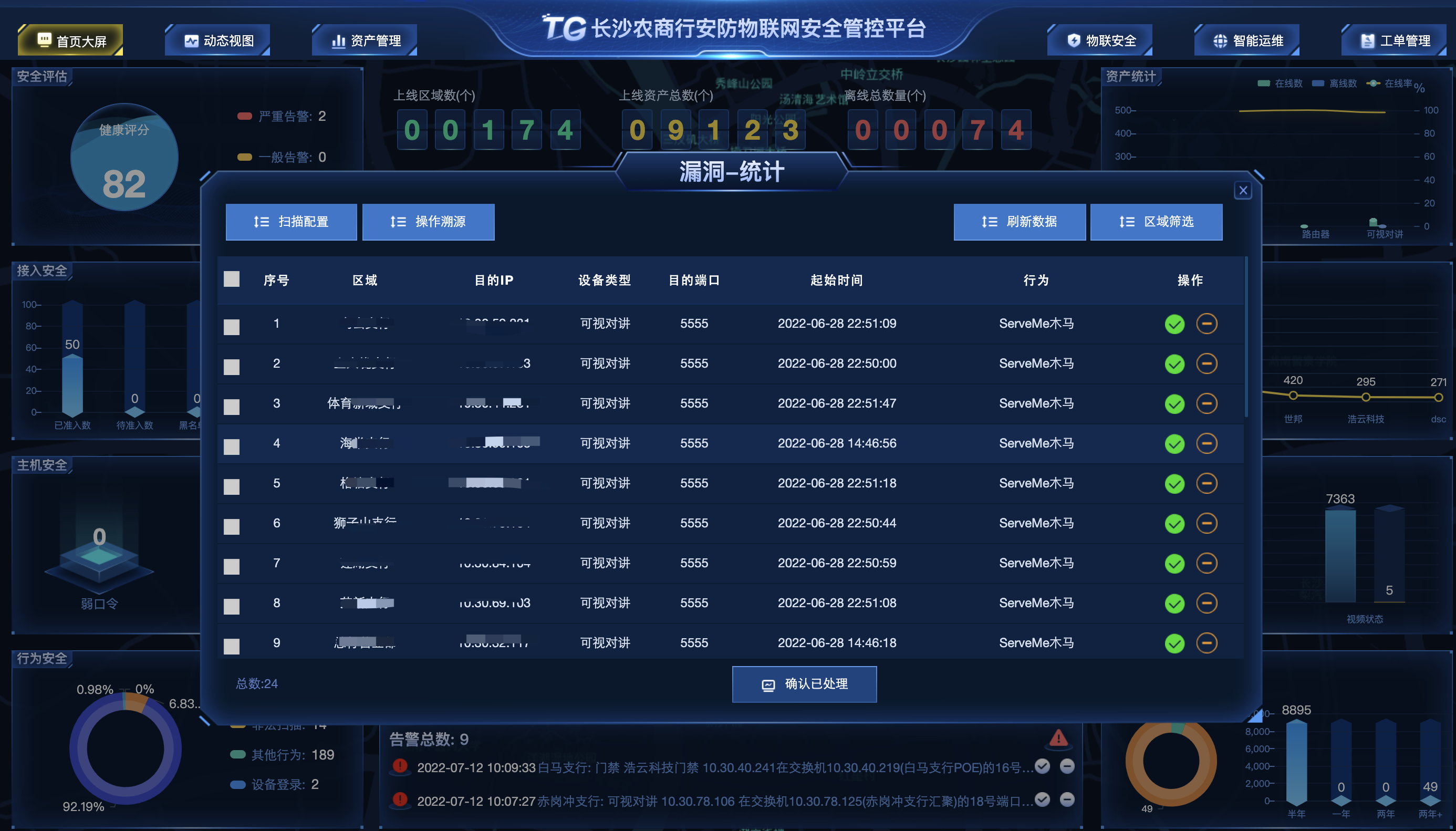 安防物联网安全防护系统,从网络安全、资产状态、网络传输质量三个维度对长沙农商行安防系统进行动态安全评估,顺利获得评分机制能够实时掌握全行安防系统当前的健康态势。