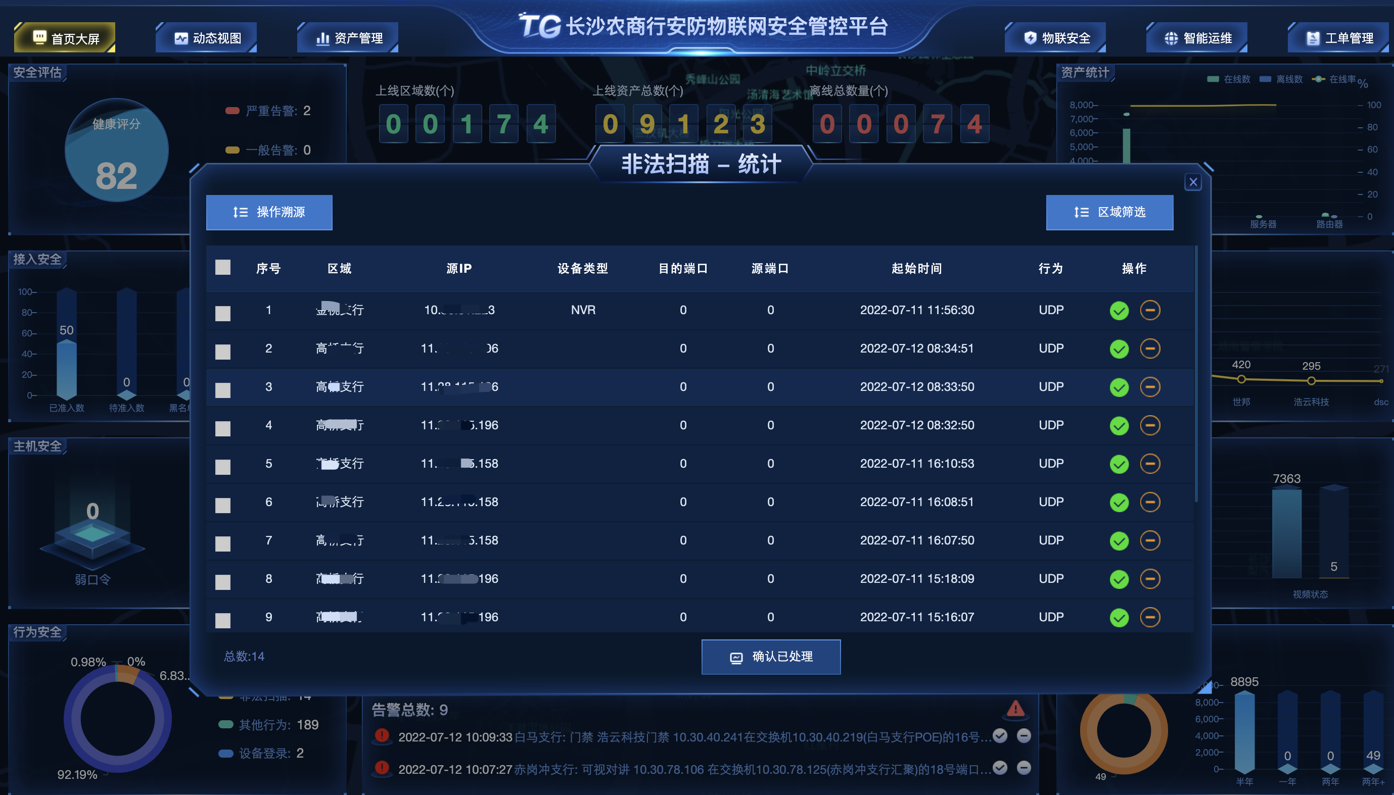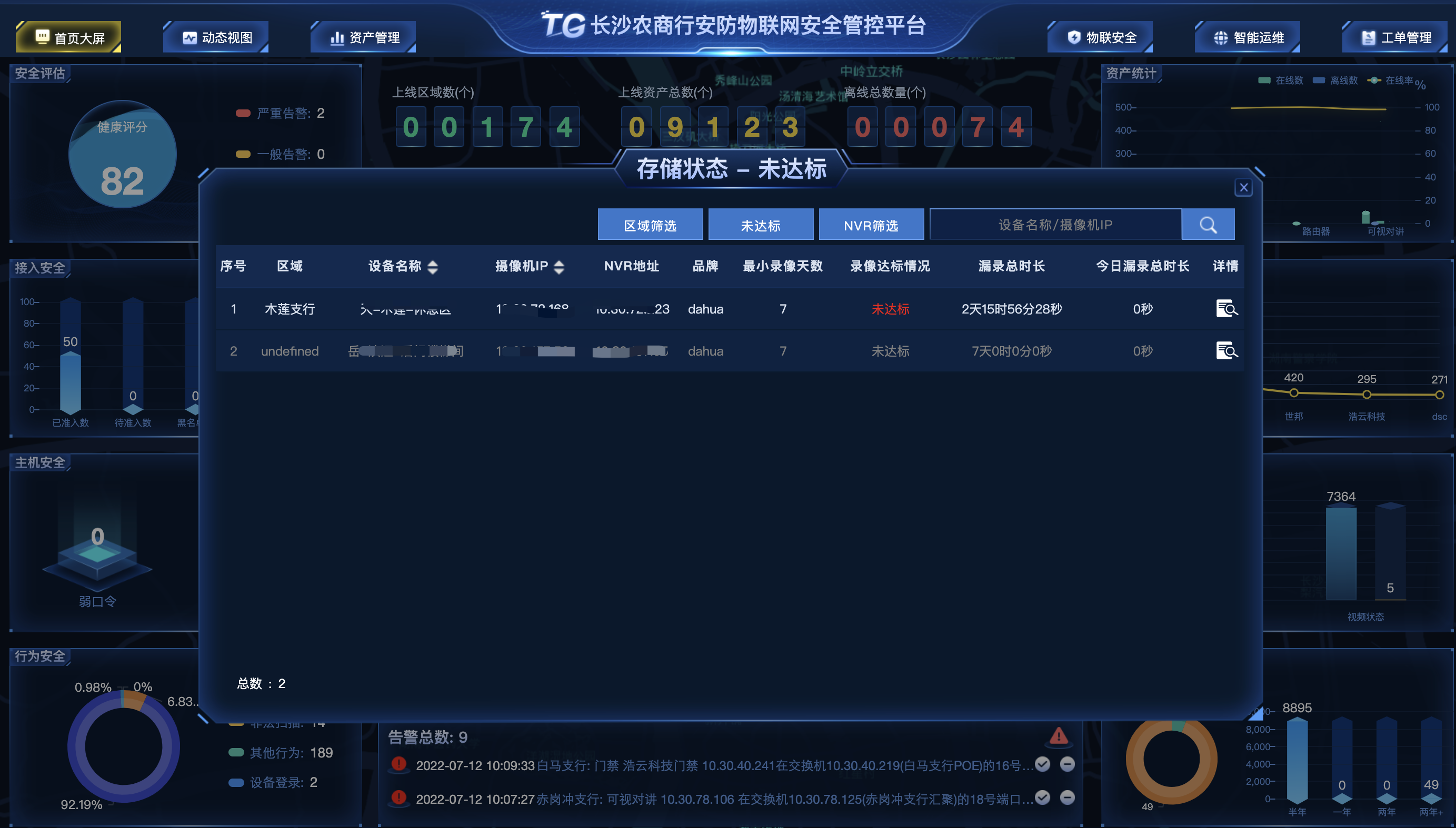 安防物联网安全防护系统实时监测安防网络的通信质量、设备在线状态、网络故障等网络异常情况,一旦发现异常及时弹窗告警,并生成日志记录方便溯源。
