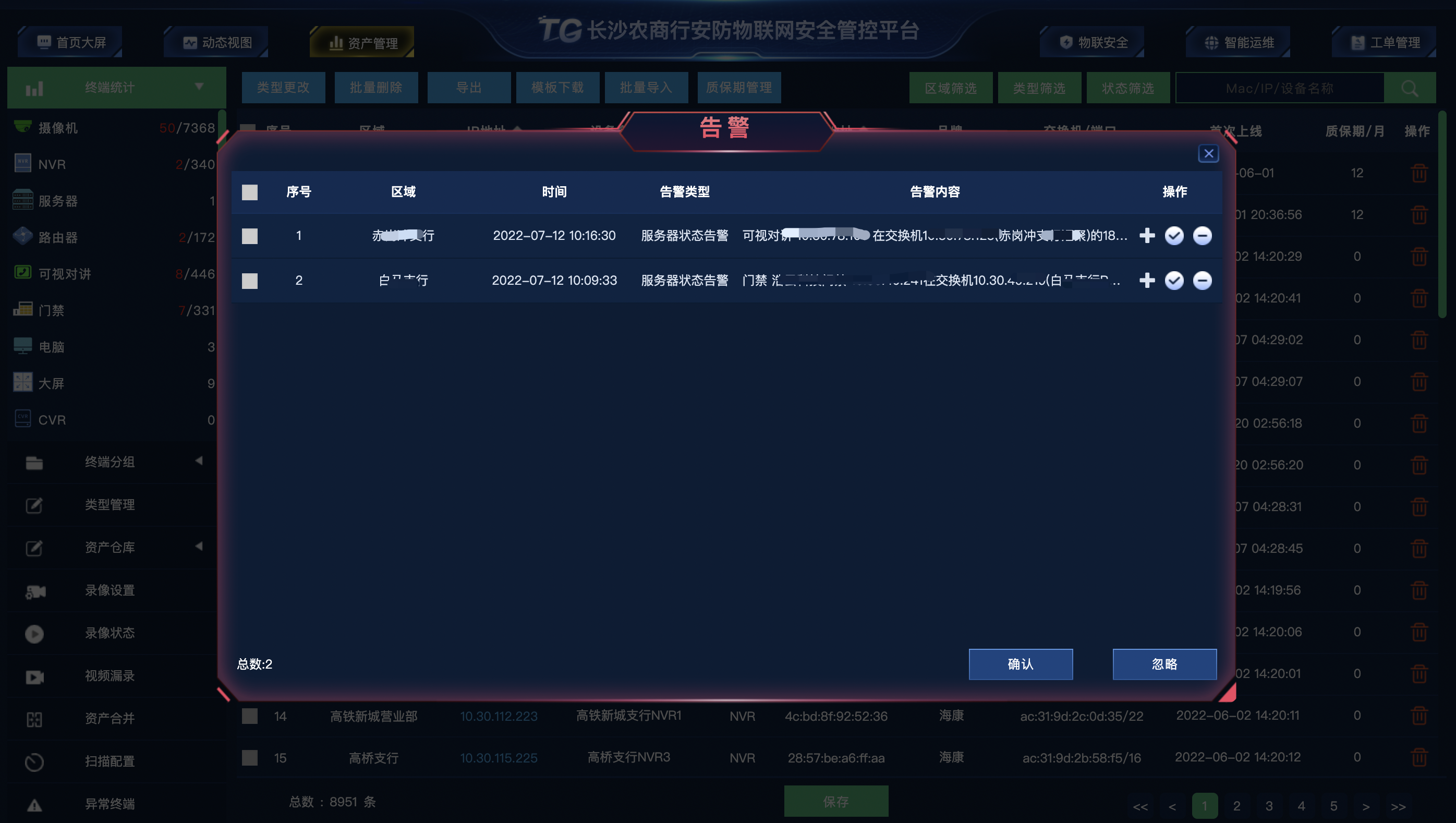 能够主动探测并识别全行所有安防设备,实现跨品牌、跨系统、跨平台安防设备的统一管理,对于安防资产的在网、退网、维修进行全生命周期的管理。